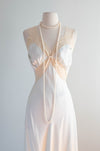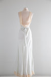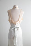 Luminous late 1930's light blue bias cut night gown by Radelle Classic Tailleur in "dress satin" silk and rayon. Slips on effortlessly over the head and ties in the back to cinch in the waist. Absolutely heavenly on! In overall excellent condition, freshly laundered and ready to wear.