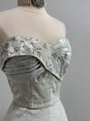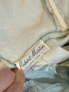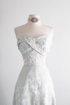 This exquisite 1950’s formal gown by Robert Martin showcases a strapless sweetheart bodice with a pleated bust, adorned with shimmering rhinestones and pearls for a glamorous touch. Crafted from what I like to call mirror blue brocade, the semi-full skirt features a deep pleat at the back, making it perfect for dancing and twirling. Zips up the side with original metal zipper. The interior bodice is boned and the gown is partially lined. In excellent condition, freshly dry cleaned and ready to wear. Perfect for a glamorous event or as an alternative wedding dress.