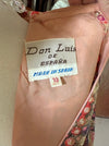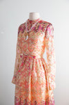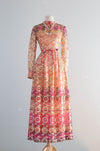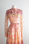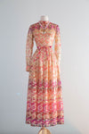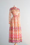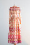 This exquisite late 1960's Don Luis de Espana evening dress features a metallic gold lame fabric with psychedelic hues of berry pink, violet, cranberry, apricot, and peach. Designed in a flattering ballet length with a high waist and bow sash, it boasts sheer sleeves and a fully lined silhouette for comfort and elegance. The dress zips up the back, offering a seamless fit perfect for sophisticated evenings or special occasions. In excellent condition, freshly dry cleaned and ready to wear.