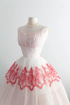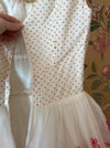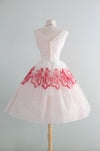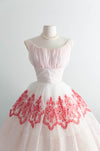 Step back in time with this enchanting late 1950's red and white Swiss dot flocked cupcake party dress. This darling dream dress features a flattering fitted waist, full pleated skirt, and elegantly gathered bust. The quadruple layered skirt creates dramatic volume while the back zipper ensures a perfect fit. Fully lined for comfort and quality, this vintage treasure will make you the belle of any special occasion. In excellent condition, freshly dry cleaned and ready to wear.