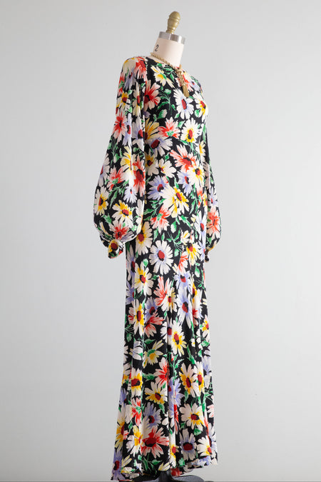 Gorgeous 1930's Rainbow Daisy Print Silk Bias Cut Gown With Bishop Sleeves / Small