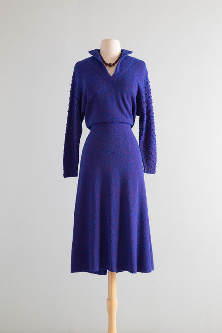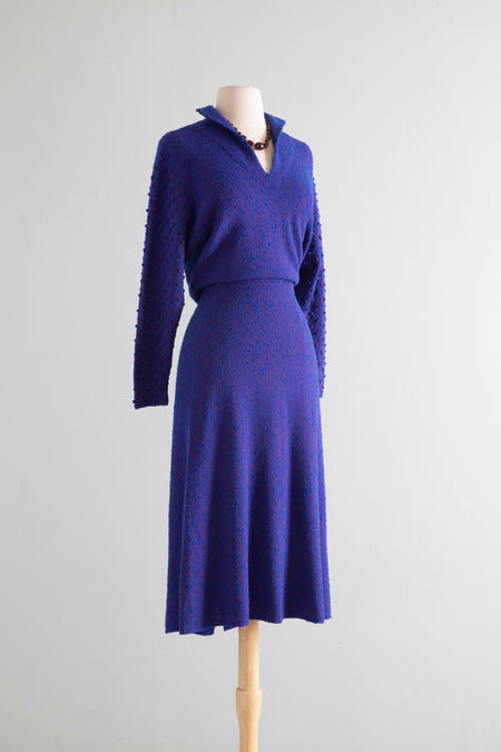 Gorgeous 1930's Hand Knit Brillant Blue & Red Dress With Beaded Sleeves / ML