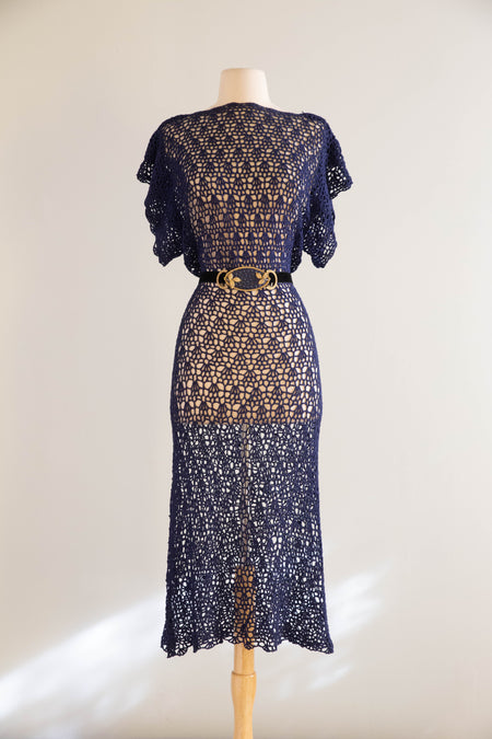 Stunning 1930's Sapphire Blue Hand-Crocheted Dress with Matching Belt / SM