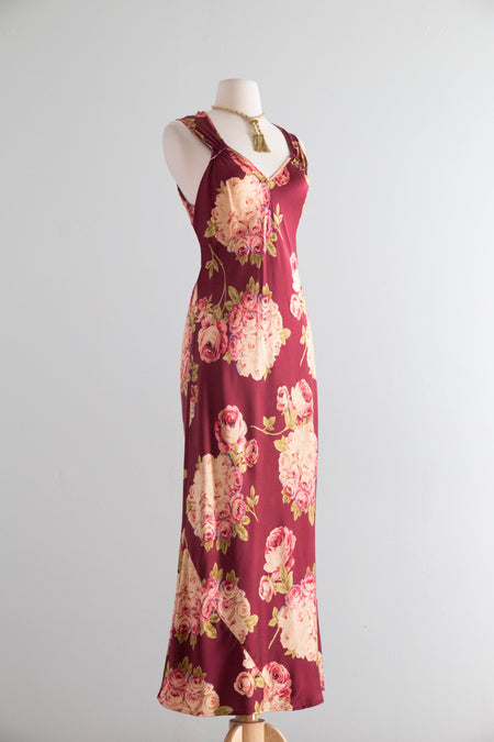 Stunning 1990's Bucolic Rose Print Silk Bias Cut Slip Dress by Mary Green / SM