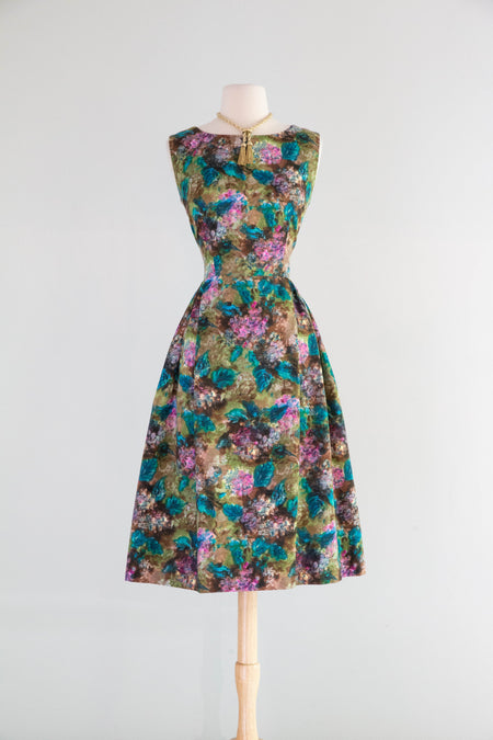 Stunning Late 1950's Lilac Blooms Polished Cotton Dress / Medium