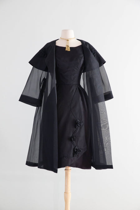 Stunning Late 1950's Black Silk Organza Cocktail Dress With Sheer Swing Coat / S