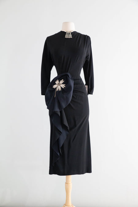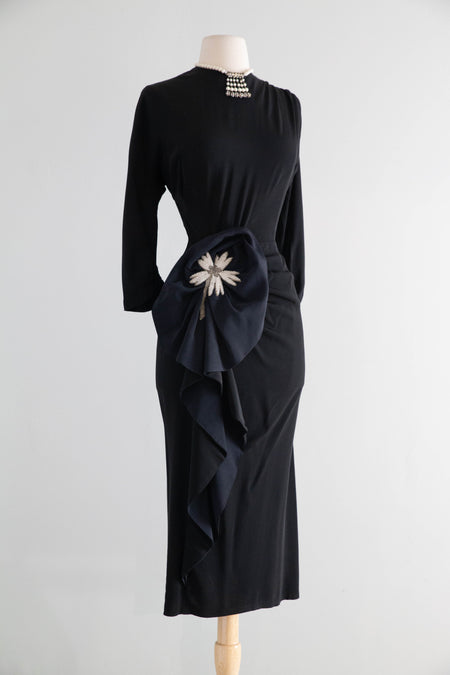 Sold Out Sublime 1940's Femme Fatale Black Cocktail Dress With Dramatic Floral Flourish / Small $198.00