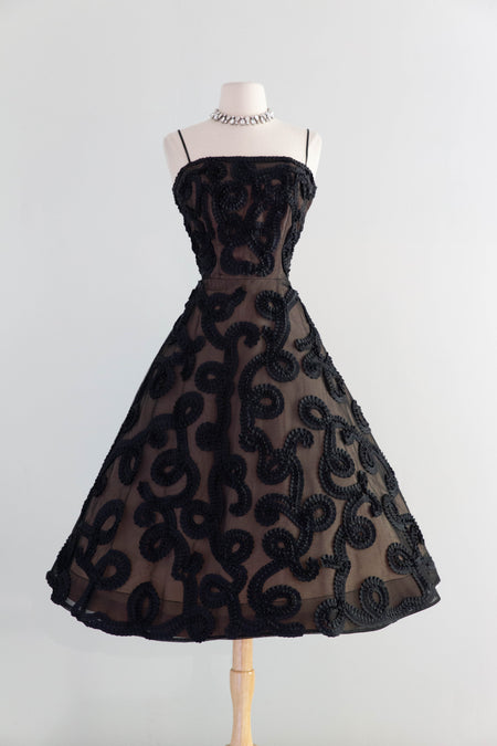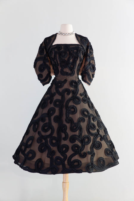 Sold Out Dramatic 1950's Black Grosgrain Ribbon Soutache Evening Dress With Bolero Jacket / SM $398.00