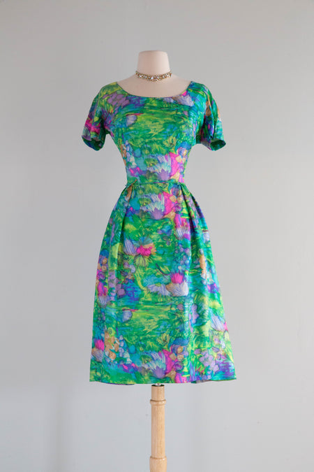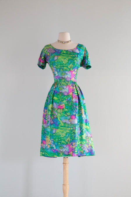 Early 1960's Monet Inspired Waterlilies Print Silk Dress / Medium