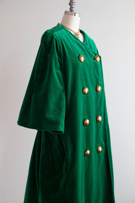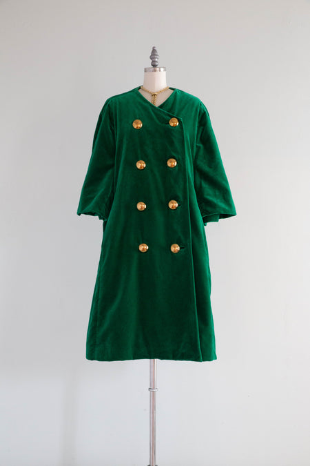Elegant 1960's Emerald Green Statement Velvet Coat With Big Brass Buttons / M