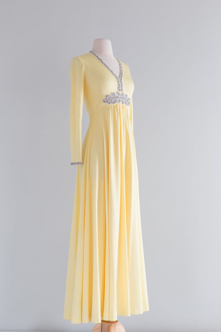 Fabulous 1970's Pastel Yellow Beaded Gown By Victoria Royal Ltd. / Small