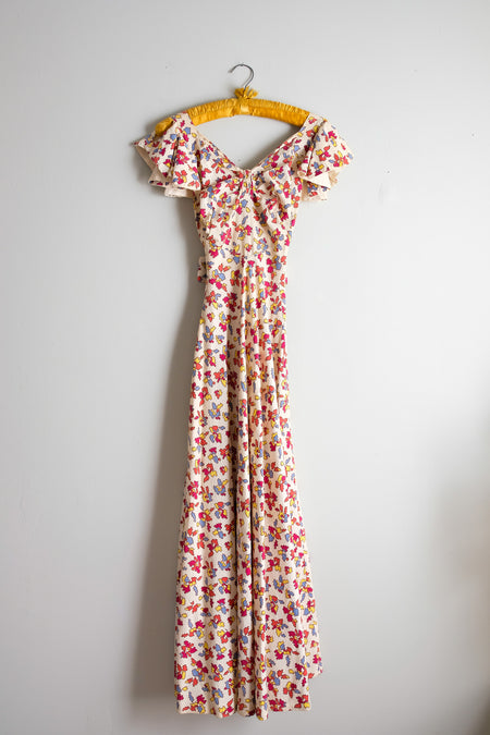 Vintage 1930's Autumnal Cotton Pique Flutter Sleeve Gown / XS