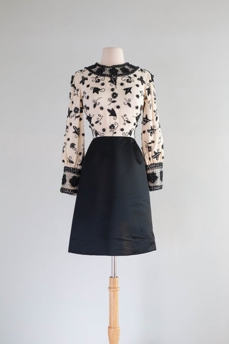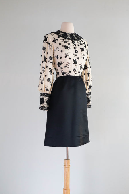 Glamorous 1960's Beaded Cocktail Dress In Bold Black & White / Small