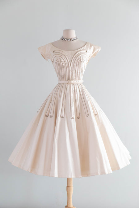 Stunning 1950's Ivory Blush Polished Cotton Party Dress With Trapunto Quilting / S