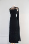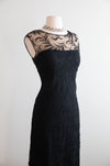This exquisite early 1960s evening gown from I. Magnin & Co. epitomizes the sophistication and drama of mid-century formalwear. Fashioned in jet-black lace with a swirling, textural motif, the gown is cut in a sleek column silhouette that elongates and flatters the figure.