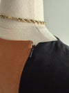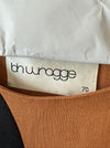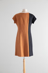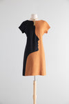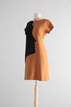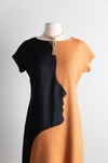 Absolutely killer 1970 silhouette dress in black silk and tawny brown linen. Made by design label BH Wragge and featuring a silhouette of a face across the body. The design is meant to be interesting from every angle and comes together seamlessly in the back with an invisible zipper. Fully lined interior. I have never seen another one like it! In excellent condition, freshly dry cleaned and ready to wear.