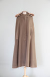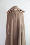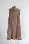 Chic and timeless, this 1970’s pure wool cape by Mr. Fred is the perfect blend of sophistication and drama. Crafted in a neutral mushroom hue, it features a sculpted hood lined in soft contrasting camel fabric, button-front closure, and slanted slit openings for ease and elegance. Fully lined in satin, it drapes beautifully for a sleek A-line silhouette. A standout vintage piece that feels just as modern and wearable today. In excellent condition, freshly dry cleaned and ready to wear. One size fits many.