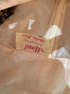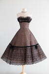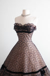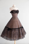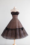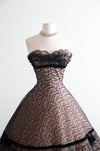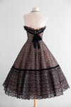 An enchanting example of 1950s evening glamour, this exquisite Minuet by Mollie Stone cocktail dress captures the essence of the decade’s romantic femininity. Crafted from delicate black lace layered over a soft blush-pink satin foundation, it creates a luminous play of texture and tone. The strapless bodice is fitted to perfection, trimmed in scalloped lace and accented with a band of black velvet that defines the bust and cinches the waist. The full circle skirt—supported by an interior tulle petticoat—flares dramatically, emphasizing the coveted New Look silhouette. A second band of velvet encircles the skirt above the hem, finished with charming side bows for a touch of whimsy and couture polish.Finished with a back metal zipper and a beautifully constructed interior, this gown reflects the quality and elegance synonymous with mid-century American design.