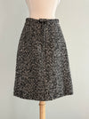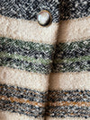 Chic 1960s custom couture wool suit in textured black-and-white wool tweed, accented with bold horizontal stripes in cream, green, orange, and blue. The fitted long-line jacket with stand collar and statement buttons channels the sophistication of Chanel’s iconic tweeds, and was surely inspired by the designer. Both the jacket and skirt are fully lined. The skirt zips up the back with its original metal zipper. Worn together or separately this set is sure to draw a million compliments this fall. In excellent condition, freshly dry cleaned and ready to wear.