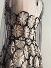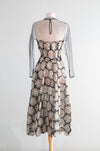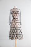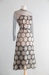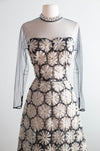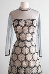 A stunning mid-century masterpiece, this 1950’s cocktail dress embodies the elegance and craftsmanship of couture fashion. The dress features a sheer black tulle overlay, delicately embroidered with dimensional silk ivory floral appliqués that create a striking contrast. The fitted bodice is framed by long illusion sleeves and a high neckline trimmed in silk. The skirt falls in a graceful A-line, and is gathered in the back. Zips up the side with original metal zipper. I have never seen anything like quite like it! Exceedingly sophisticated and chic with a modern look and feel to it. In overall excellent condition. Clean and ready to wear.