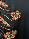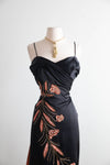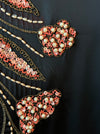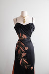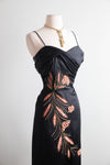 Exquisite 1950s black satin cocktail dress by Emma Domb California, famed for her glamorous evening creations. This figure-hugging design features a ruched bodice with slim straps, a hand-beaded coral and gold floral motif cascading down the front, and surprise coral lined fly-away panels at the back for a flash of color and drama!