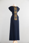 A striking and rare Karl Lagerfeld evening gown, crafted in fluid midnight-navy silk and embellished with dramatic Egyptian influenced gold beadwork. The gown features a long, elegant column silhouette with cap sleeves, a sculpted waist, and deep hip pockets.