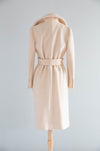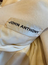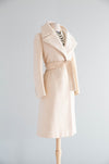 A stunning 1970s wool trench coat by John Anthony, rendered in a soft ivory tone and cut with elegant, confident lines. The design features a sculptural folded collar with wide lapels, a clean wrap-style front, and a self-fabric belt that cinches the waist to create a fluid, elongated silhouette. Expert tailoring is evident in the gently shaped shoulders, long streamlined sleeves with buttoned cuffs, and the smooth, uninterrupted skirt falling to mid-calf. Minimalist yet luxurious, the coat reflects John Anthony’s signature approach to modern sophistication and timeless appeal. Fully lined interior. In very good condition with signs of wear. Freshly dry cleaned and ready to wear.