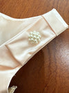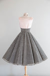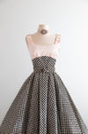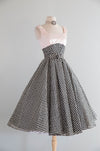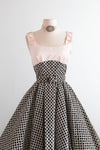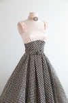 A breathtaking 1950s cocktail dress by Larry Aldrich, nearly identical to the one famously worn by 50's supermodel Jean Patchett. The pale pink satin bodice features a sculpted neckline with wide bow-trimmed straps adorned in clusters of faux pearls. A full, sweeping circle skirt in black and white lattice net creates the quintessential New Look silhouette, complete with a matching belt to define the waist.