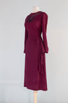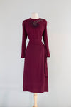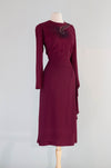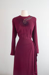 Elegant 1940s glamour at its finest — this deep claret rayon crepe dress features long clean lines, soft draping at the hip, and a striking beaded starburst and vine motif at the neckline. With its figure flattering silhouette and sparkling glass beadwork, this piece captures the sophistication of the era while remaining timelessly chic. Featuring long sleeves, padded shoulders and original metal zipper up the side. In overall excellent condition, freshly dry cleaned and ready to wear.