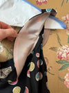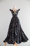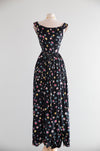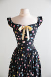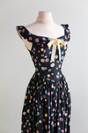 A fabulous example of late-1940s party dressing, this Party Lines by Emma Domb rayon dress features a striking black background scattered with colorful bubble motifs in pastel pink, blue, yellow, and ivory. The fitted bodice is cut with a softly squared neckline and wide shoulder straps, accented at the center front with an pale yellow ribbon bow for a playful, feminine touch.