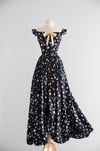 The nipped-in basque waist flows into a full gathered skirt with subtle bubble shaping at the hem, accented in the center with a black velvet bow creating buoyant movement and a flattering silhouette. Finished with a clean, elegant back and metal zipper up the side, this dress perfectly captures Emma Domb’s celebrated blend of youthful charm and sophisticated construction—ideal for cocktail wear, special events, or collectors of iconic American mid-century design. In overall excellent condition, freshly dry cleaned and ready to wear.