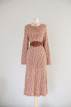 This vintage 1970s boucle knit dress features a textured, long-sleeve design with a slim fitted silhouette. Crafted from speckled yarns blending pink, brown, and mauve tones, it offers a scoop neckline and a pull-on style with no zippers or fastenings. Ideal for comfortable yet elegant fall wear, this freshly cleaned piece pairs beautifully with accessories like the Donna Karan belt (sold separately).