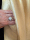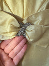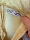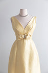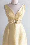 A luminous example of 1960s elegance, this I. Magnin gown is crafted from rich shantung silk in a soft buttery yellow hue. Designed in a true petite proportion, it features a flattering deep V neckline, sculpted bodice, and a gently flared skirt that moves beautifully. A chic rhinestone bow brooch defines the waist, adding just the right touch of sparkle, while hidden side pockets lend both charm and practicality. Zips up the back with original zipper. An elegant , timeless evening dress from one of America’s most prestigious retailers—perfect for cocktails, formal occasions, or a modern bride seeking understated vintage glamour. In overall excellent condition, freshly dry cleaned and ready to wear.