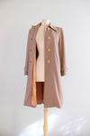 Elegant 1940s film noir style with this gorgeous wool gabardine coat in soft French beige. Creamy yellow buttons in the front, with a sleek pointed collar and trench style cuff straps capture the era's refined aesthetic. Wrapped in a sumptuous peach satin lining, this coat offers both visual appeal and tactile comfort. Expertly cleaned and ready to wear, it's the perfect addition for anyone seeking authentic vintage character with enduring appeal.