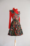 The cutest 1950s holiday plaid pinafore dress. Crafted from comfortable cotton, this sleeveless beauty features delicate ruffles cascading from the shoulders and a dramatically tiered skirt that cinches at the waist for a flattering silhouette. The back metal zipper ensures an easy fit, while the festive plaid pattern brings instant vintage appeal to your wardrobe. Freshly cleaned and ready to wear, this is the perfect piece for the holidays!