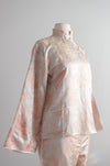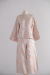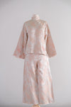 Exquisite 1950s Chinese silk pajama set. Oyster grey and pale pink, crafted from luxurious silk, this two-piece treasure beautiful brocade details. The blouse showcases charming knot-style buttons while practical front pockets add everyday functionality. Pair it with matching wide-leg pants featuring a comfortable elastic waistband for a flattering, relaxed fit. Freshly cleaned and ready to wear, this vintage gem brings authentic mid-century sophistication to your wardrobe.