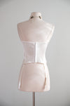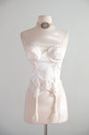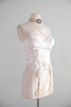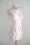 This exquisite 1990s Victoria's Secret strapless bustier exemplifies the era's refined approach to intimate wear. Crafted from luxurious ivory silk satin, the piece features intricate lace embellishments framing the neckline and cup detailing. The structured design includes lined cups for support and definition, complemented by detachable garter straps for versatile styling. A dual-row hook-and-eye closure system at the back ensures a customizable fit. Freshly cleaned and prepared for immediate wear, this vintage treasure captures the quality of the brand's 1990s collections.