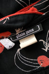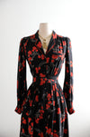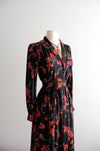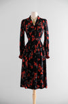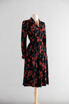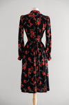 This charming 1970s dress by Sweet Jane, predating Esprit, features a black rayon fabric adorned with a delightful red cherry print. Designed with long sleeves, front buttons, and wrap ties at the waist both front and back, it exemplifies authentic 1970s fashion. Recently cleaned and in excellent condition, this dress is ready to wear!