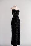 Indulge in early 2000's glamour with this stunning black velvet gown from Cosabella, crafted in Italy. The luxuriously soft stretch velvet hugs your curves while the romantic sweetheart neckline and delicate lace accents create an irresistibly alluring silhouette. Strategic side cutouts add modern edge, while an intricate floral shadow print elevates the design. Adjustable thin straps ensure a personalized fit, and the seamless construction means effortless elegance—no zips required. Impeccably cleaned and ready to make an entrance.