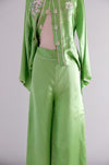 exquisite 1950s Chinese silk pajama set in sophisticated lime green. Crafted from luxurious silk and bearing the "Elegant Art Special Made" label, this two-piece treasure features delicate ivory floral embroidery and lace accents adorning the front. The blouse showcases charming knot-style buttons and a coordinating waist tie for effortless styling, while practical front pockets add everyday functionality. Pair it with the generously cut wide-leg pants featuring a comfortable elastic waistband for a flattering, relaxed fit. Meticulously cleaned and ready to wear, this vintage gem brings authentic mid-century sophistication to your wardrobe.