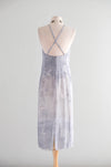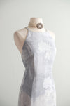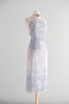 This exquisite Giorgio Armani dress from the 1990s epitomizes 90’s minimalist chic. Crafted from delicate silk chiffon in a soft mirror gray, the dress features an understated abstract floral motif that catches the light beautifully. The sleeveless silhouette showcases graceful criss-crossing straps at the back, while the double-layered tissue-thin fabric creates an ethereal, flowing movement. A discreet back zip ensures a seamless fit. Professionally cleaned, this vintage treasure is ready to make a sophisticated statement at your next special occasion!