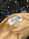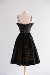 This exquisite 1950s Lou-Ette dress exemplifies mid-century elegance with its sophisticated black eyelet cotton construction layered over a soft beige foundation. The bodice showcases intricate pleating that creates dimensional shaping, while delicate dual straps provide refined support. The voluminous skirt delivers that coveted full silhouette characteristic of the era. A concealed back metal zipper ensures a seamless fit. The eyelet detailing adds textural interest and charm to this darling dress. Professionally cleaned and ready for wear, dress is a timeless addition to any vintage collection.