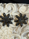 A magnificent mid-century parure by Miriam Haskell, renowned for her opulent, hand-crafted costume jewelry worn by society women and Hollywood stars alike. This dazzling floral necklace and earring set exemplifies Haskell’s signature artistry and meticulous hand-assembly under the direction of Frank Hess, her longtime head designer. Each bloom is composed of layers of champagne, clear crystal, and jet black glass stones, arranged in radiant daisy-like clusters. Faceted navette and round rhinestones are hand-wired onto antiqued brass filigree backings—a hallmark of Haskell construction—creating a dimensional, light-catching effect. The adjustable necklace fastens with a hook closure adorned with faceted glass beads and bears the oval “Miriam Haskell” signature tag. Matching earrings echo the necklace’s floral motif, with clip backs and the same gilt-filigree craftsmanship.