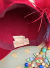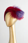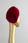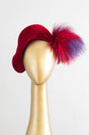 Fashioned in luxurious scarlet red velour, the hat is styled in an asymmetrical, close-fitting silhouette that perches elegantly to one side of the head—a hallmark of the late 1940s and early 1950s “tilt” hat trend. A dramatic pom of two-tone feathers in crimson and violet bursts from the side, adding dynamic movement and a touch of whimsy to its sleek architectural shape.