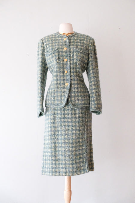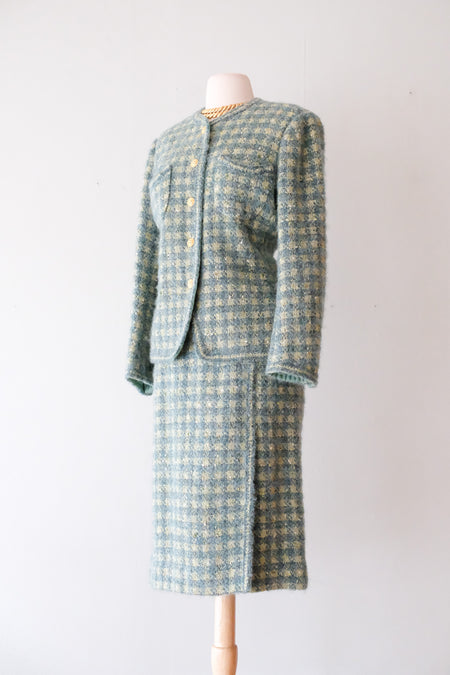 Chic 1990's Sage & Teal Chanel Inspired Tweed Suit Set / Sz M