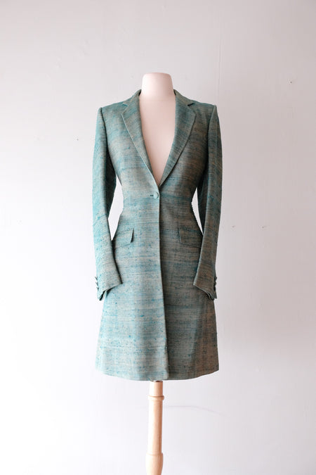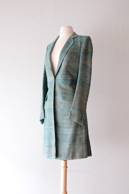 Fab 1970's Emerald & Gold Slub Silk Fitted Coat / Sz Med