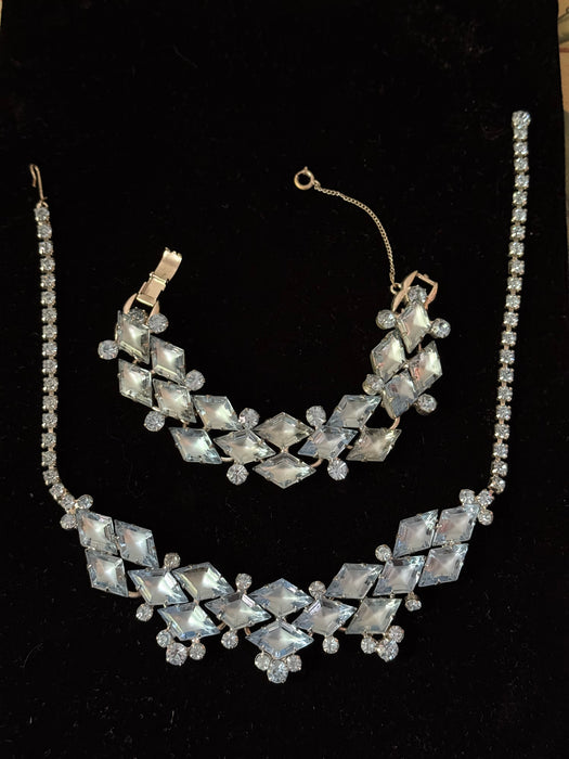 Absolutely gorgeous 1950’s palest blue rhinestone necklace and matching bracelet set. This Juliana design features kite 🪁 shaped stones in a silver tone setting. The necklace is adjustable in length and can be worn as a choker or necklace. Both pieces are in excellent condition.
