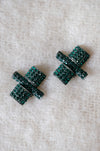 Stunning 1980's emerald green modernist clip-on earrings. Unique criss-cross design covered in small green rhinestones. Signed Jay Feinberg. Ready to wear!