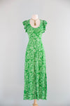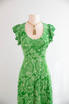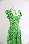 The epitome of 70's spring fashion, comes this beautiful fern green maxi dress in silky poly jersey. Featuring a flattering scoop neckline, ruffled shoulders, empire waist and fabulous tie back. Zips up the back. In excellent condition, freshly washed and ready to wear.