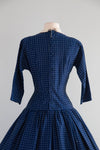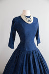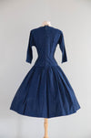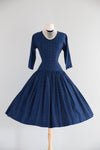 The quintessential early 1950's New Look era cotton dress in classic navy blue by Lanz in a rare Herbert Meyer fabric. The fabric itself is remarkable. A medium weight cotton with a subtle nubby texture and printed with oblong polka dots. Lanz was famous for their impeccable construction and reluctance to use zipper, opting instead for buttons, snaps and hook and eyes. This dress features a flattering dropped waist, three quarter sleeves, and a full gathered skirt. In excellent condition, freshly cleaned and ready to wear.